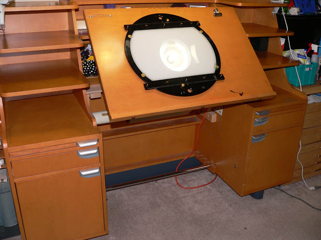 Over break I decided that my New Year needed some changing up, my office/studio space is just not as work friendly as I would like and desperately need. I made the decision that it was time to sell my Walt Disney Animation desk that I purchased before I left the studio here in Orlando Florida when it closed. Little bit of a hard decision for sentimental reasons but the lovely lady is just not being utilized the way that she needs to be. And I need a desk/ table that I can cut fabrics, pin projects, and layout designs on. I also needed something that has more storage for all of the yummy fabrics and goodies that I have on hand to design new products for the store. So yes, the desk has gone up for sale for the original price that I bought her for, $1200. Contact me if you are interested. As of right now I do have a buyer interested but nothing has been finalized yet. I have quite a few people interested so far. She's already been pushed off into a corner in another room until the right owner has claimed her as their own.